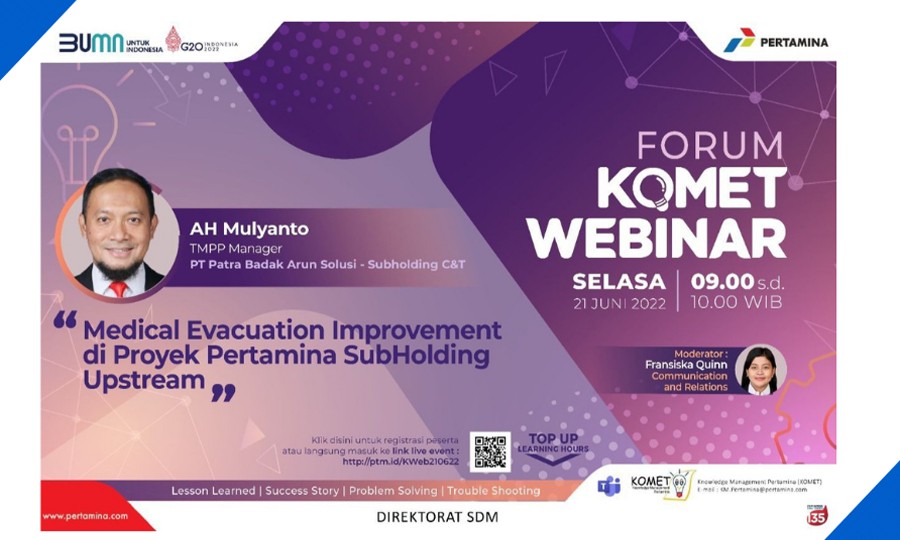PT Patra Badak Arun Solusi Subsidiary PT Pertamina Patra Niaga Subholding Commercial & Trading hadir dalam semangat berbagi pengetahuan kepada Perwira Pertamina pada Selasa, 21 Juni 2022 Sesi 1 pukul 09.00 - 10.00 WIB dalam Forum Sharing KOMET Webinar. Sharing yang disampaikan pada webinar tersebut mengenai Medical Evacuation Improvement di Proyek Pertamina SubHolding Upstream. The More You Share, The More You Get. Let's Share Knowledge!