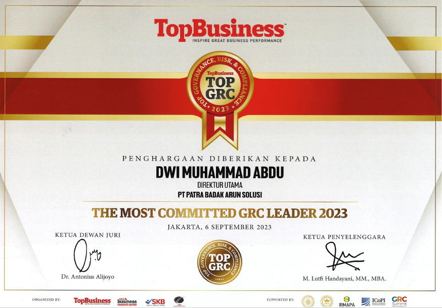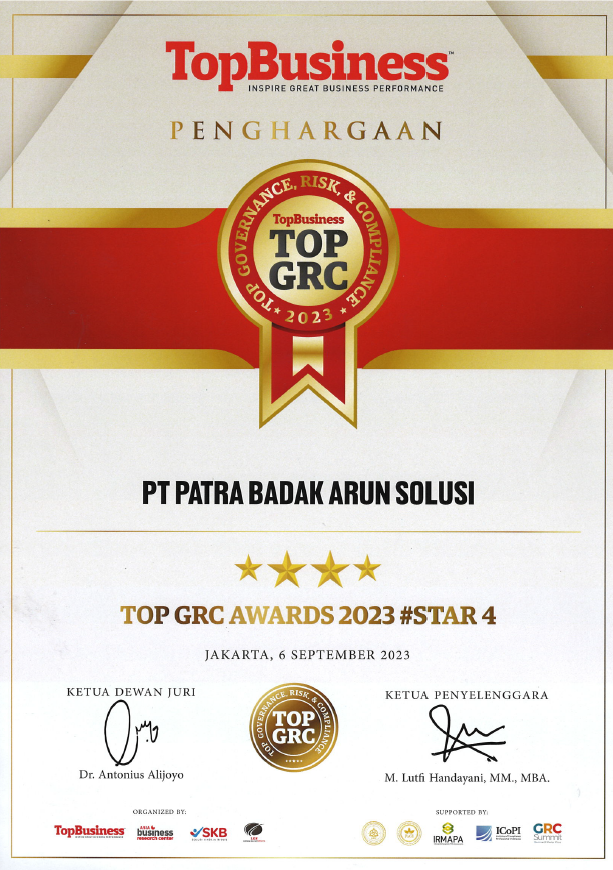 Jakarta, 6 September 2023 - PT Patra Badak Arun Solusi berhasil meraih 2 Penghargaan pada TOP GRC Awards 2023 yang mengusung tema Building Resilient Future Through ESG (Environment, Social, and Governance) and Governance, Risk, and Compliance (GRC). Wawancara Penjurian telah dilaksanakan pada Rabu, 12 Juli 2023 secara online.