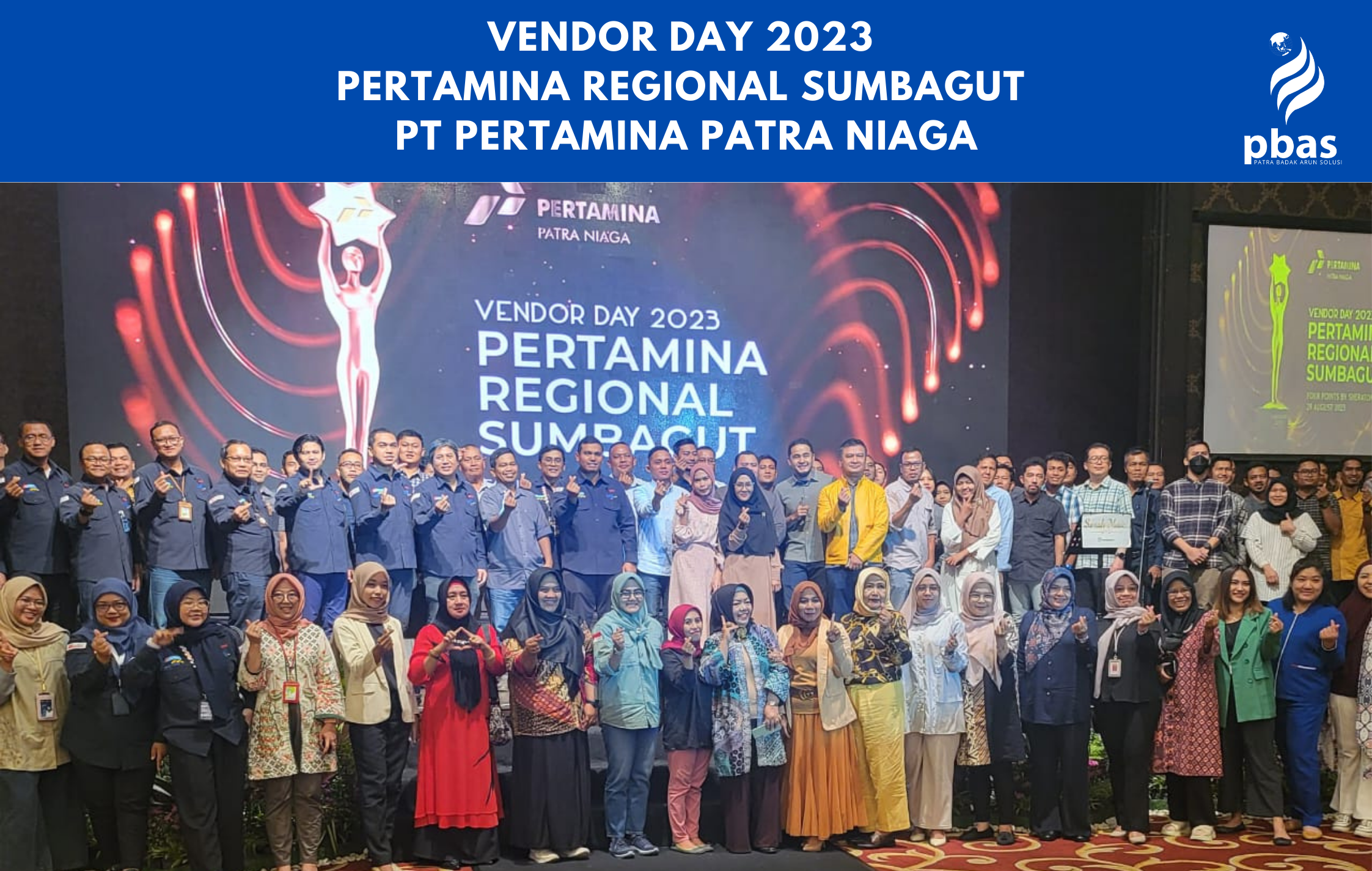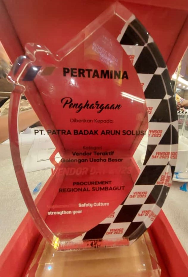 Jakarta, 29 Agustus 2023 - PT Patra Badak Arun Solusi (PBAS) berhasil mendapatkan penghargaan dengan kategori Vendor Teraktif Golongan Usaha Besar dalam agenda Vendor Day Regional Sumbagut 2023 PT Pertamina Patra Niaga. Kegiatan ini telah dilaksanakan pada 29 Agustus 2023 di Grand Ballroom - Hotel Fourpoint, Medan yang turut dihadiri oleh Area Manager Dumai selaku perwakilan Jajaran Direksi dan Manajemen PBAS.