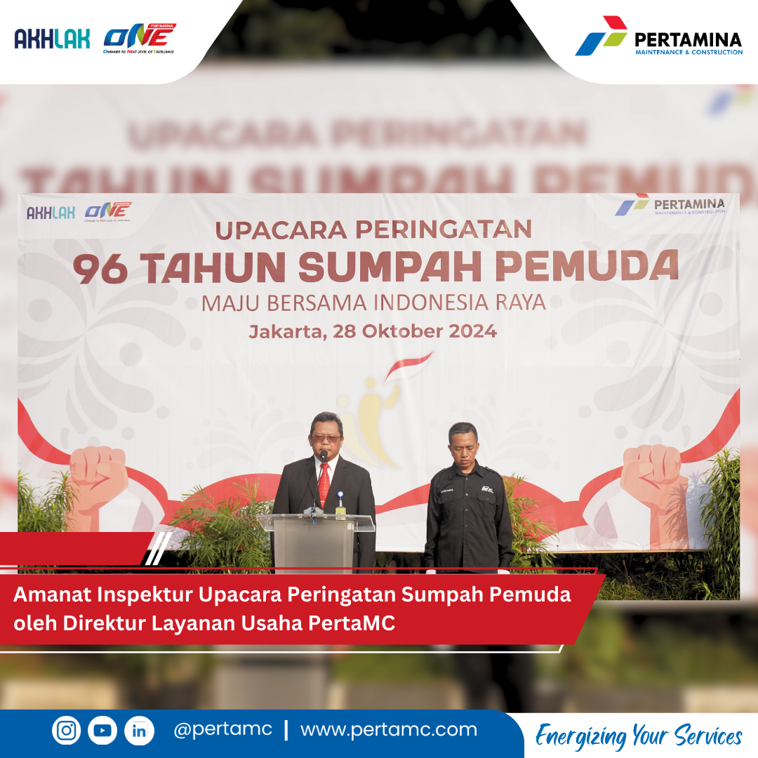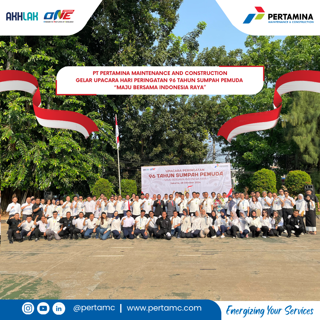 Jakarta - Dalam rangka memperingati 96 Tahun Sumpah Pemuda, PT Pertamina Maintenance and Construction (PertaMC) menggelar Upacara Peringatan dengan tema “Maju Bersama Indonesia Raya”. Tema ini mengingatkan kita akan pentingnya semangat kolaborasi dan persatuan dalam membangun bangsa yang lebih baik.