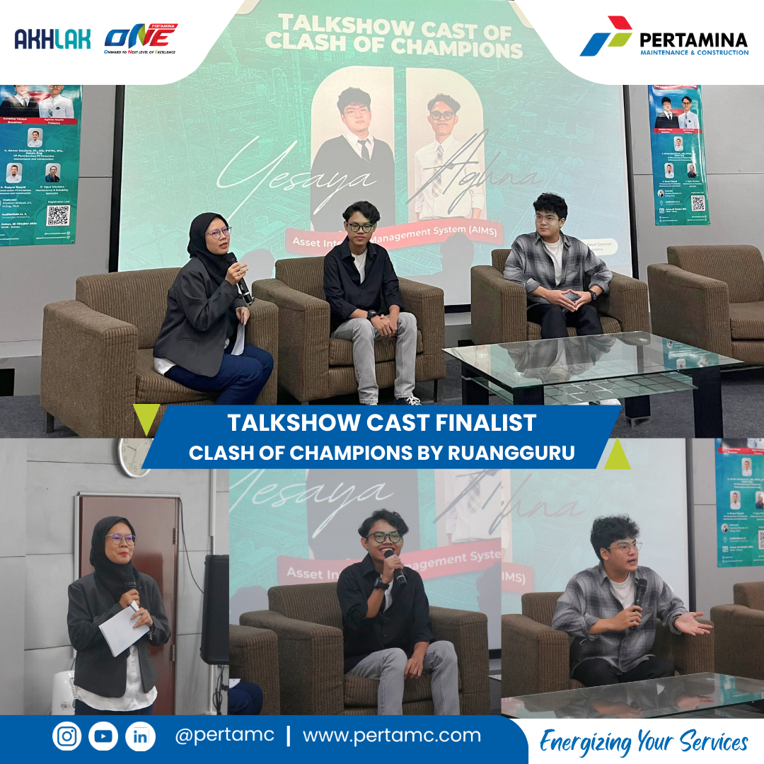 Sesi Sharing Session oleh Narasumber dari PT Pertamina Maintenance and Construction (PertaMC) yaitu VP Plant Service, VP Construction, Maintenance & Reliability Specialist PertaMC serta turut menghadirkan Talkshow dengan Guest Star Cast Finalist Clash of Champion by Ruang Guru yaitu Xaverius Yesaya Bunalven dan Aghna Naufal Pratama.