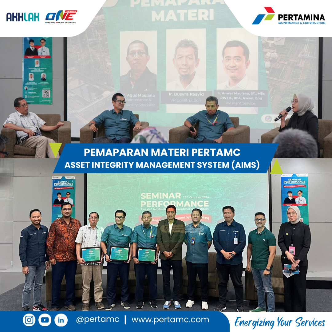 Jakarta - PT Pertamina Maintenance and Construction (PertaMC) bersama Universitas Pertamina melakukan kolaborasi sinergi yang berkelanjutan dengan mengadakan agenda Seminar Nasional PERFORMANCE (PertaMC for Maintenance Excellence Competition) pada Jumat, 25 Oktober 2024. Seminar kali ini mengangkat tema Asset Integrity Management System (AIMS) guna menjaga keberlanjutan industri dan ketahanan energi di masa depan yang selaras dengan target PT Pertamina (Persero).