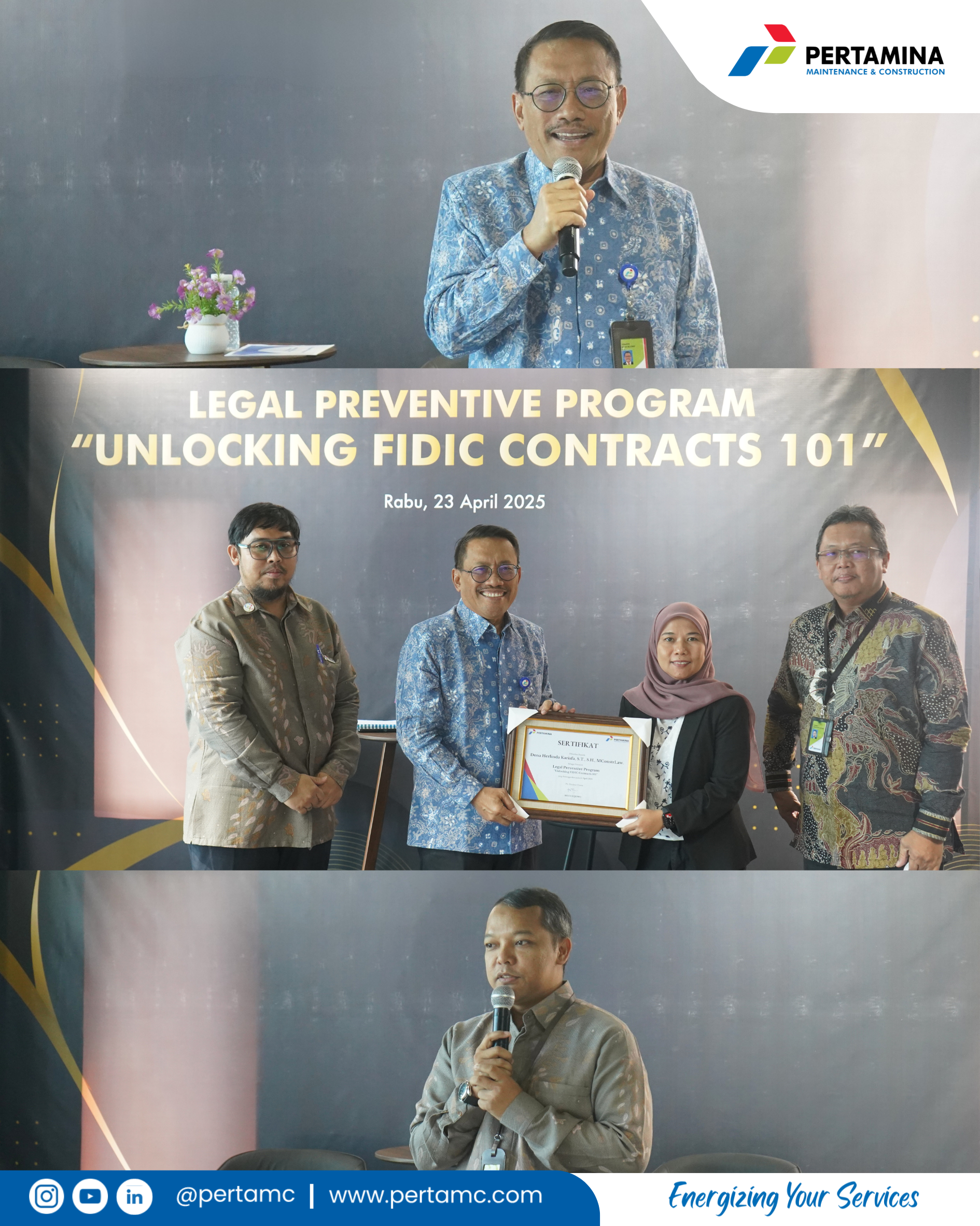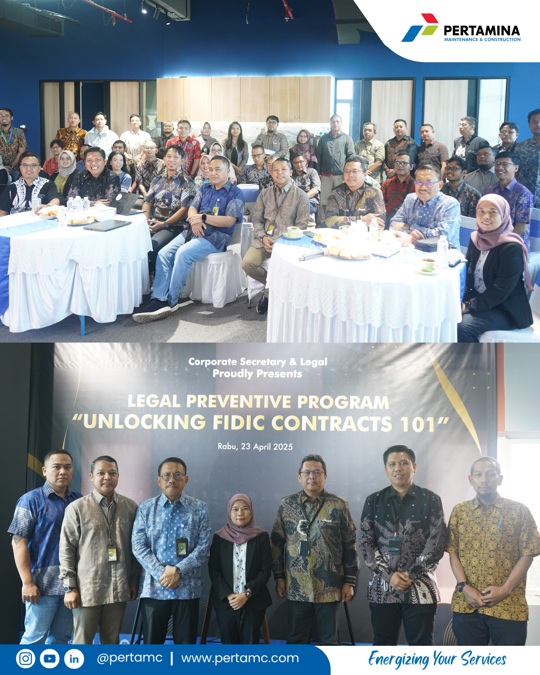 Jakarta, 23 April 2025 – Pertamina Maintenance & Construction (PertaMC) melalui fungsi Corporate Secretary & Legal kembali menunjukkan komitmennya dalam membangun budaya kepatuhan dan penguatan kapabilitas insan proyek melalui penyelenggaraan Legal Preventive Program bertajuk “Unlocking FIDIC Contracts 101”.